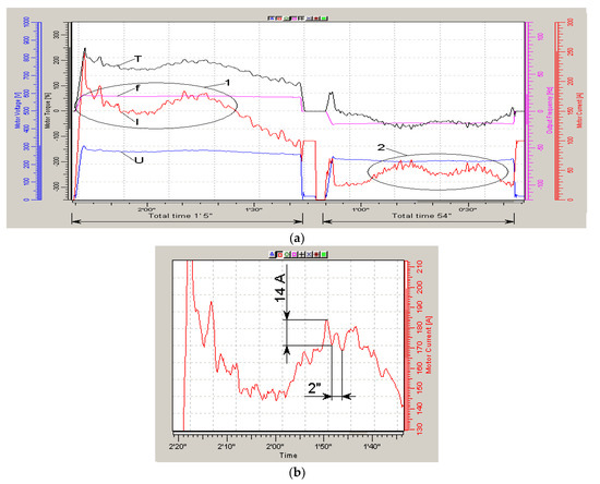 The timing diagrams were taken by the NCDrive program, while the effective values of the stator currents (red diagram) were obtained by direct measurements and the torque diagram (black diagram) was obtained by the calculation method in the Vacon converter. Therefore, the analysis will be carried out mainly according to the diagrams of the effective values of the stator current of the traction motor (I).