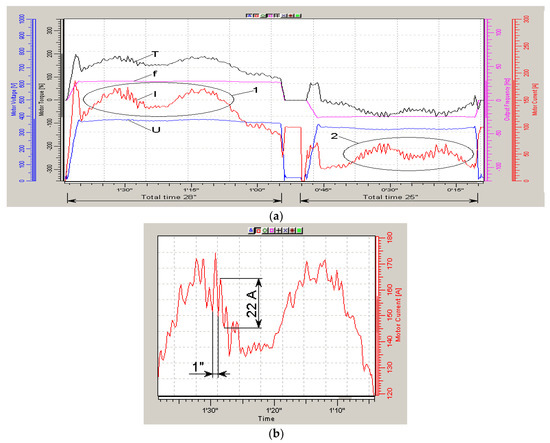 By changing the parameters of the stator voltage, it was possible to reduce the average effective values of the stator currents by 20%, increasing the carrying capacity by the same 20% (Figure 3a,b) when driving at an average speed. At the same time, it turned out that with an increase in the main magnetic flux on track 1, the stator currents decrease at high loads and increase at low loads when driving along track 2 (Figure 4) with smaller slopes. Similar results were obtained in a number of studies, such as, for example, in article [1], published in 2021.