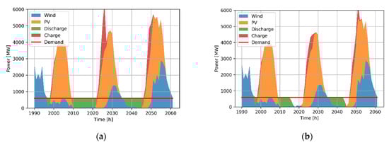 where and are the hourly energy output from the wind system and PV system, respectively. The energy that is transferred each hour from and to the thermal or electric battery storage device, is , while is the hourly demand, which is constant 600 MWh. The hourly energy from the renewable power supply that is consumed by the industrial process is defined in each time step as: