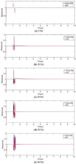 It can be seen from Figure 8 and Table 3 that the response curves between the fuzzy PID control system and the PID control system almost overlap after the addition of 3 Hz interference signal. However, the time for the fuzzy PID control system to reach the steady state was shortened by 0.318% compared with that of the PID control system. After the interference signal with a frequency of 10 Hz was added, the response of the fuzzy PID control system showed no overshoot, while the response of the PID control system showed a large overshoot in a short time. In addition, the time of the former to the steady state was shortened by 5.619% compared with the latter. After the interference signal with a frequency of 20Hz was added, the fuzzy PID control system had a large overshoot in a short period of time compared with the PID control system. In the rest of the time, the fluctuation range of the response of the fuzzy PID control system to interference was smaller than that of the PID control system. Moreover, the response time of the fuzzy PID control system needed to reach the steady state was shortened by 16.526% when the PID control system was in a steady state. After the interference signals of 30 Hz and 40 Hz were added, the oscillation frequency of the PID control system was higher than that of the fuzzy PID control system. The time taken to reach the steady state increased by 6.157% and 6.936%, respectively. After the interference signal with a frequency of 50 Hz was added, there was little difference between the response oscillations of the two, but the response of the fuzzy PID control system to the steady state was equal to a 7.227% shorter time. Therefore, according to the simulation results, compared with the PID control system, the fuzzy PID control system had stronger stability and better ability to resist interference in the face of external vibration interference, so it was also more suitable for the field work environment.