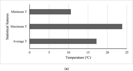 In the following phase, the pilot study was set to optimum conditions (unit orientation, water pool depth, atmospheric conditions, and water flow continuity) and the effects of the different temperatures (maximum, minimum and average temperatures) were appraised. The different assessed temperatures and output fluxes under optimum conditions are demonstrated in Figure 12a,b.