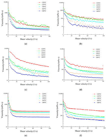 In order to investigate the temperature resistance of the synthetic polymer, the rheology in the temperature range of 120~180 °C was studied. The experimental results are shown in Figure 6.