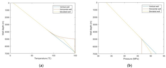 - Calculate the initial value of wellbore temperature distribution, Tini, by Equation (44). The initial value of wellbore pressure distribution, pini, can be obtained linearly from the initial bottomhole pressure to wellhead pressure.