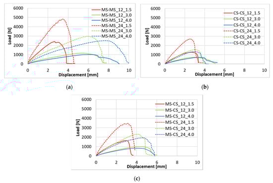 Load-displacement curves for the configurations MS-MS (a), CS-CS (b) and MS-CS (c).