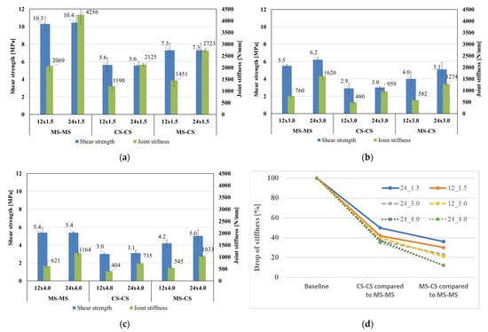 Shear strengths and stiffnesses for the configurations MS-MS (a), CS-CS (b) and MS-CS (c); decrease of stiffness for the different adhesive configurations (d).