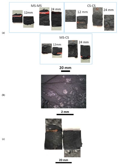 Figure 4a–c illustrate the representative failure surfaces obtained for the different configurations, a higher magnification of the CS-CS failure surface and an optical microscope image that shows the adhesive spots that have been depicted on CS specimens, respectively. Figure 4a shows that MS-MS configuration exhibits a fully cohesive failure (the SLJ samples fail through the adhesive) for both adhesive joints prepared with both 12 and 24 mm overlaps. The adhesive joints prepared with composite specimens and with dissimilar substrates macroscopically present a cohesive failure as well. However, a mixed adhesive/cohesive failure mode can be detected in Figure 4b,c by observing the small brighter spots using a microscope. In particular, Figure 4b presents some clearer areas that are zones of the visible surface of the CFRP substrate. As shown in Section 3.1, this led to a lower value of the shear strength. Figure 4c shows also that the adhesive failure spots are not always uniformly spread on the whole surface but are limited to the right part of the substrate in this specific case. However, the inspection of all the substrates involved in the experimental campaign showed that the spots can be present in different parts of the substrates. As a proof of this behaviour, CS-CS_12 mm and CS_CS_24 mm shown in Figure 4a present these spots on the left side and the top part. On the other hand, MS-CS_12 mm and MS-CS_24 mm show that these areas are on the right and top part of the specimens, respectively.