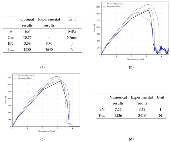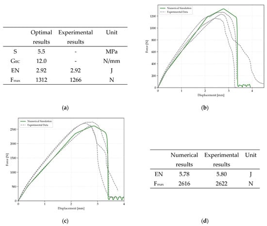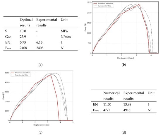 Figure 6 shows the results obtained on the SLJ configuration made with composite substrates CS-CS. Figure 6a displays a table with the results of the optimisation procedure that has been used to simulate the SLJ made with 12 mm overlap. It is worth noticing that the value of the shear strength for the CS-CS configuration is reduced by 45%, similar to the experimental results. Figure 6b shows the comparison between experimental and numerical curves related to the CS-CS configuration made with 12 mm overlap. A very good agreement is found for the initial trend, the maximum load, slightly higher in the numerical simulation, and the final displacement. The results illustrated in Figure 6c display that a very good agreement is also found for 24 mm overlap configuration. Finally, the table reported in Figure 6d shows that the numerical and experimental results of the absorbed energy and maximum load, are very close to each other, confirming the good agreement of the FEM analysis.