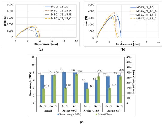The results of the ageing cycles presented in Section 2.1 are reported in this section. As reported in Section 2.1, the SLJ tests have been carried out for three different ageing cycles on the configuration MS-CS prepared with both 12 and 24 mm overlaps and with a thickness of 1.5 mm, which is the advised datasheet thickness. Figure 8 presents the load-displacement curves of the MS-CS configuration with an overlap of 12 mm before and after the ageing cycle (a), the load-displacement curves for the configuration with an overlap of 24 mm before and after the ageing cycle (b) and the summary of the results with the shear strengths and stiffnesses (c). Figure 8a,b show that the load-displacement curve of SLJ prepared with both 12 and 24 mm overlaps present the same initial trend. For both graphs, the maximum load is slightly higher for the SLJ tests after the ageing A, which is the cycle that conditioned the SLJ at 90 °C. On the other hand, the maximum load illustrates that the SLJ tests after the ageing B led to slightly lower loads while cycle C is not influencing the load-displacement curve. Figure 8c reports the summary of the results related to the ageing cycles. The comparison between the unaged SLJ and SLJ aged with cycle A show that there is a slight increase in the shear strength although it is not significant by looking at the presented error bars. On the other hand, SLJ conditioned with cycle B exhibit a slight decrease in the shear strength. This slight drop was also reported by Ciardiello et al. [] for the same adhesive and an ageing cycle that presents high relative humidity. The drop is 25% for the SLJ prepared with 12 mm overlap and 15% for the SLJ prepared with 24 mm overlap. Finally, the stiffnesses reported in Figure 8c show that their values do not vary after the ageing cycles.