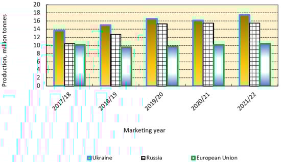 Ukraine was ranked first in global sunflower seed production. Its share was approximately 30% (Figure 1) [,]. Thus, Ukraine has abundant sunflower field-based and process-based residues that can be used for bioenergy.