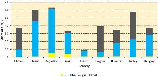 In major producers of sunflower oil, the share of hydrocarbon fossil fuels in electricity generation varies from 9% (France) to 60–62% (the Russian Federation and Argentina) [,,,]. Turkey, Bulgaria, and Ukraine have the highest share of coal in power generation (Figure 3). In addition to carbon dioxide, the combustion of fossil fuels emits many harmful compounds, such as nitrogen oxides, sulfur dioxide, particles, etc. []. Coal-based power plants are significant contributors to these emissions []. Sunflower husks are a waste product of sunflower oil production. According to conventional technology, this waste product is stored in landfills, and its storage results in GHG emissions of approximately 433 kgCO2eq./t [].