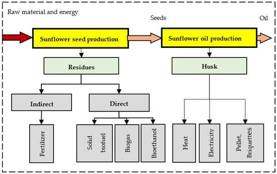Sunflower residues can be used in different ways: the substitution of mineral fertilizers (indirect input energy) and heat and power generation (direct input energy) (Figure 4). In this study, we considered the following methods for energy conversion: anaerobic digestion of crop residues, fermentation of crop residues, and direct incineration of crop residues and husk.