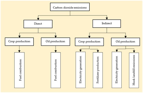 The energy supply systems of oil plants based on biomass waste have been studied by numerous researchers, such as Booneimsri et al. [], Azhdari et al. [], Ion et al. [], Donaldson et al. [], and others. Alcock et al. [] revealed the following structure of greenhouse gas emissions: cultivation—62.16%, processing—25.41%, packing—11.35%, and transportation—1.08%. For this reason, the main focus of this study was on the cultivation and processing (the largest emission items).