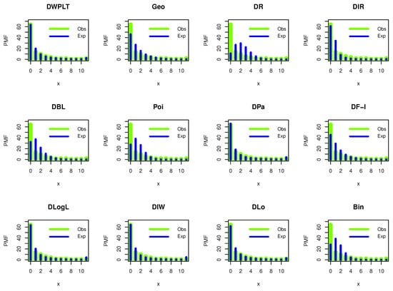 In this section, we illustrate the flexibility of the DWPLT model by using real medical data. Here, we examine the fitting capability of the DWPLT distribution with other competitive distributions, namely, geometric (Geo), discrete Rayleigh (DR) (see Roy [2]), discrete inverse Rayleigh (DIR), (see Hussain and Ahmad [8]), discrete Bilal (DBL; see Altun et al. [21]), Poisson (Poi; see Poisson [22]), discrete Pareto (DPa; see Krishna and Pundir [3]), one-parameter discrete flexible (DF-I; see Eliwa and El-Morshedy [23]), discrete log-logistic (DLogL; see Para and Jan [24]), discrete inverse Weibull (DIW; see Jazi et al. [5]), discrete Lomax (DLo; see Para and Jan [25]), binomial (Bin), discrete Burr Type II (DB-II; see Para and Jan [25]), one-parameter discrete Lindley (DL-I), two-parameter discrete Lindley (DL-II), three-parameter discrete Lindley (DL-III), Poisson Lindley (PoiL; see Shanker and Mishra [26]), natural discrete Lindley (NDL; see Almazah et al. [27]), discrete inverted Topp-Leone (DITL; see Eldeeb et al. [28]), and discrete gamma Lindley (DGL; see El-Morshedy et al. [29]) distributions. The fitted models were compared using the criteria of negative maximized log-likelihood (), Akaike information criterion (Ac), corrected Akaike information criterion (CAc), Hannan–Quinn information criterion (Hc), Bayesian information criterion (Bc), and the chi-squared (Chi) test with its corresponding P-value (Pv) based on the degree of freedom (Dm). The Ac is a mathematical approach for evaluating and discussing the suitability of a distribution for the real data from which it was generated. In statistics, the Ac is applied to compare different possible distributions and models, and to select the most appropriate distribution/model for the data. The standard correction of Akaike’s information criterion assumes the same predictors for training and validation, thus underestimating the prediction error of random predictors. The CAc was derived for regression models containing a mixture of random and fixed predictors. Both Ac and CAc are estimators of the prediction error and thus the relative quality of statistical distributions for a given set of real data. The Hc is a measure of the suitability of statistical distribution that is often applied as a criterion for distribution selection among a limited set of models; it is not based on the log-likelihood function, but is related to the Ac. The Hc is an alternative to Ac in some positions in practical fields. In statistics, the Bc or Schwarz information criterion is for distribution selection among a finite set of distributions where models with a lower Bc are generally preferred. It is partly based on the probability function and is closely related to the Ac. When fitting distributions, it is possible to increase the probability by adding parameters, but this may result in overfitting. Bc, Ac, and CAc try to solve this problem by proposing a partial term for the number of parameters in the distribution. The penalty duration is greater in Bc than that in Ac for samples larger than 7. Bc was derived and developed by Gideon E. Schwarz. who provided a Bayesian argument for its adoption. Lastly, chi-squared is a statistical suitability test utilized to determine whether a variable is likely to have come from a specified distribution. It is often applied to assess whether sample data are representative of the entire population. The chi-squared quality-of-fit test, in other words, is a kind of Pearson chi-squared test. Statisticians can apply it to test whether the observed distribution of a categorical variable differs from their expectations.