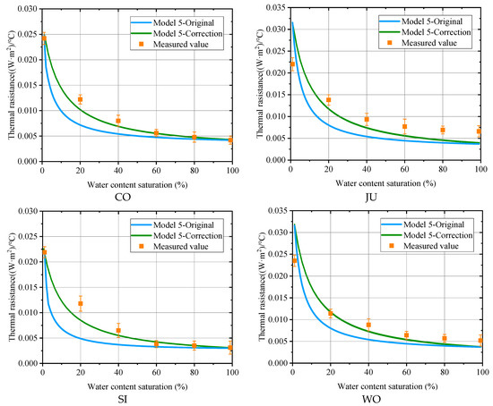 According to the assumptions of the theoretical model (i.e., the voids in the fabric are uniform and constant), the model was revised by using the water content saturation instead of the moisture content to characterize the proportion of water in the fabric system voids. The study compared the fitting relationship between the prediction curve and experimental measurements before and after the revision of Model 5, as shown in Figure 4. From the figure, it can be clearly seen that the prediction curve is generally lower than the measured value, especially when using the original model. The revised model can obtain results closer to the measured value than the original model. Among the 10 sets of revised model prediction curves, 8 sets (80%) had R2 values ranging from 0.95 to 0.99. Only one set of the revised model (NE group) had an R2 value lower than 0.90 (R2 = 0.896), which was higher than the original model (R2 = 0.824) by 0.072. However, this was still higher than the acceptable range of R2 values required by correlation analysis (R2 > 0.8) [30]. It was also found that, especially at low water content saturation levels, the slope of the prediction curve of the revised model was smaller than that of the original model and the downward trend was more gentle, which was in line with the experimental test results. Comparison of the model prediction curve with the experimental results by Mangat et al. [3] also revealed that the original model always underestimated the thermal resistance compared with the actual measurement. Using water content saturation instead of moisture content can effectively improve the prediction accuracy of the model. The experimental results support the applicability of the model in predicting the wet-state thermal resistance of single-layer woven fabrics, indicating a great consistency between the measured and predicted values. Therefore, this study suggests that the revised Model 5 be used as the optimal model for predicting the wet-state thermal resistance of fabrics.