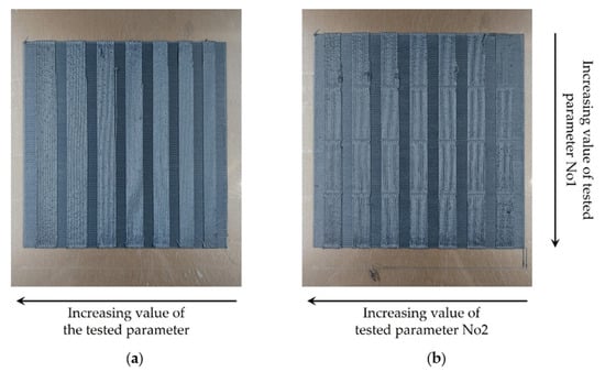 Samples of the printability tests. (a) Printing sample with one varying process parameter. (b) Printing sample with two varying process parameters.