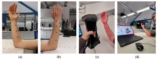 - A series of measurements of main limb dimensions are performed, which are to be used as reference points to enhance measurement accuracy and facilitate 3D model creation. These typically include relevant lengths and circumferences of the area of interest, such as the distance between the wrist and the elbow, the length of the arm, circumferences of the palm, the wrist, and the elbow, as well as fixed points, such as the elbow and wrist joints.