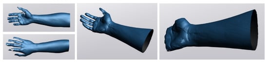 A major challenge during the scanning process is ensuring that the patient maintains stillness in the established position throughout the duration of data acquisition, especially in case their particular injury causes discomfort, as can be observed in Figure 3. In some cases, scaffolding to support the limb may be required. In every case, the scanning equipment operator is obligated to complete the procedure in the minimum time possible while being mindful so as to avoid loss of quality. An additional issue encountered during this process refers to the geometry acquisition of the patient’s fingers (Figure 3). Spacing between digits needs to be clear in order to produce a distinguishable geometry. In most splint design cases, this information is irrelevant to produce the brace, though, in instances where capturing the geometry of the fingers is necessary, careful consideration must be applied, especially around the area of the thumb. On the occasion where the fingers’ area is of significant importance to the final design, a set of smaller lenses can be attached to the scanning equipment, depending on the scanner model. Figure 4 provides a characteristic example of the 3D model of a scanned arm. In the presented case, a Creaform HandySCAN 700 laser 3D scanner (Creaform, Lévis, Canada) was utilized to imprint the arm geometry. The scanner was selected due to its nominal resolution of 50 μm (with accuracy up to 30 μm) [] and high acquisition speed, which allowed for the fast completion of the procedure. Due to compatibility reasons, the VXElements suite was employed; specifically, we used VXscan for scanning and VXmodel for the initial editing of the digital files.