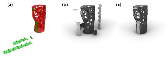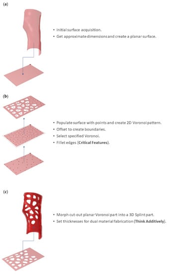 Step 2 involves the retrieval of the principal limb surfaces for the introduction of a hollowed Voronoi tessellation pattern []. After the simplification of the 3D-scanned polygon mesh by means of polygon reduction, the mesh is converted into a polysurface. The polysurface is then translated into two principal input surfaces that are employed in all further computational design procedures and lead to the formation of all the WHO sub-components. Based on the approximate dimensions of the principal input surfaces, rectangular XY planar surfaces are created (Figure 6a). A Voronoi pattern is generated on each planar rectangular surface (Figure 6b). Both the number of Voronoi cells and the frame thickness can be parametrically adjusted by the user. The pattern density can be further locally optimized by means of additional centroids and scaling down of the cells. The sharp edges of the Voronoi cell polygons are subsequently smoothed through a filleting feature. The 2D-hollowed Voronoi tessellated surfaces are then morphed to adapt to the principal input surfaces, while two thickness variants are created for assigning dual-material properties to the WHO for immobilization, tactile sensation, and comfort (Figure 6c).