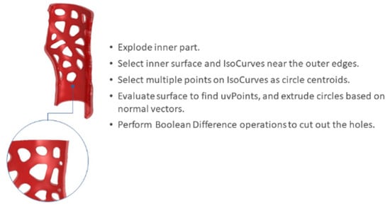 Step 3 involves the creation of the fastening mechanisms’ openings on both dual-material parts (Figure 7). The inner solid part is exploded, and the inner surface is selected. IsoCurves (in the U direction) close to the outer edges of the surfaces are designated. Multiple UV points on the selected IsoCurves are then defined as centroids for the circular profiles of the openings. The circular profiles are extruded based on the normal vectors at the respective UV points. The cylindrical extrusions are then cut out from the dual material parts by means of Boolean difference operations.