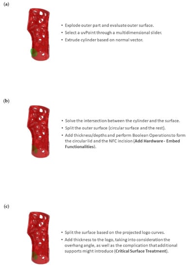 Integration of NFC tag: (a) evaluation of outer surface for the selection of a UV point as a circular profile centroid aimed for the NFC incision; (b) Boolean operations for the NFC incision and lid formation; and (c) addition of detailed features considering overhang angles.
