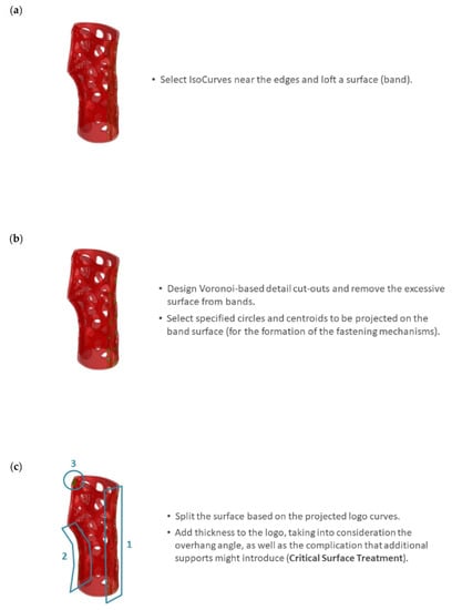 Step 5 involves the formation of band surfaces for flexible donning and doffing operations (i.e., putting the device on and taking it off). The uppermost outer surfaces are selected for the creation of the band surfaces, and IsoCurves in both the U and V directions are defined. Cut-out rectangular surfaces that form the basis of the bands are then created (Figure 9a). A filtering Python script employing an IF statement is developed To proceed with trimming the rectangular bands based on the Voronoi tessellation and the circular cut-out details (Figure 9b). The intersections between the Voronoi curves and the IsoCurves are then used to trim the edges of the band surfaces. Finally, the circular profiles are projected onto the new trimmed surfaces, and their centroids are defined. The circular curves and their respective centroids are subsequently deployed for the detailed fastening mechanisms (see Step 6). In the present study, the procedure is repeated for the formation of three bands (Figure 9c).