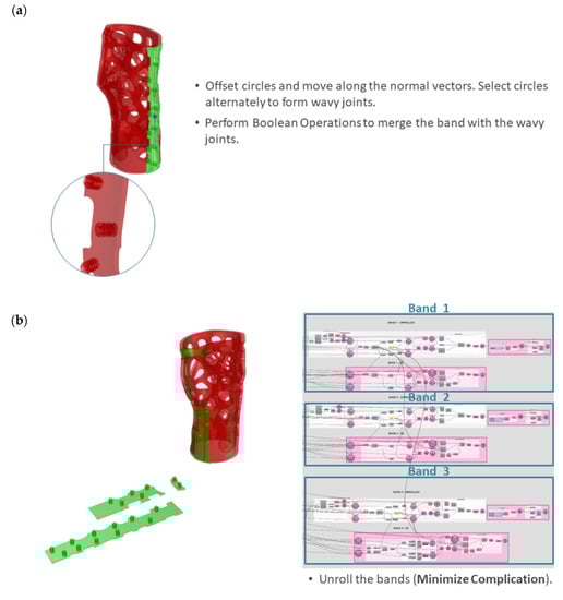 Step 6 includes all necessary processes for the formation of three 3D bands with fastening mechanisms, as well as an unrolling process to minimize complications during fabrication. Firstly, the three trimmed surfaces are offset outwards as solids. For the fastening details, grafted arrays of the circular profiles created in Step 5 are formed based on the normal vectors of the tangent circular profiles’ UV centroids. Then the grafted curves are alternately selected by means of a culling pattern and scaled down. Subsequently, the remaining non-scaled grafted curves are selected based on the inverse culling pattern. The data are then woven and lofted into solid fastening details with a sine wave pattern (Figure 10a). Finally, the wavy fastening details are joined with the bands via Boolean operations. In order to make the intricate bands manufacturable, they are finally unrolled in the XY plane (Figure 10b).