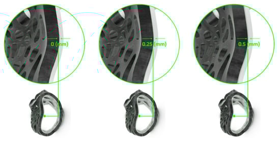Multiple design variations can be produced by selectively adjusting the global input parameters of the precompiled customization tool, as set in Step 1. For instance, the outer parts’ inner surface is parametrically offset to precisely control the distance between the two material cases, aiming for both robust dual-material attachment and easy detachment for sorting and recycling (Figure 11).