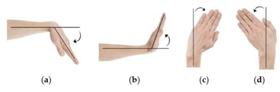 - Delp, S.L.; Grierson, A.E.; Buchanan, T.S. Maximum Isometric Moments Generated by the Wrist Muscles in Flexion-Extension and Radial-Ulnar Deviation. J. Biomech. 1996, 29, 1371–1375. [Google Scholar] [CrossRef] [PubMed]