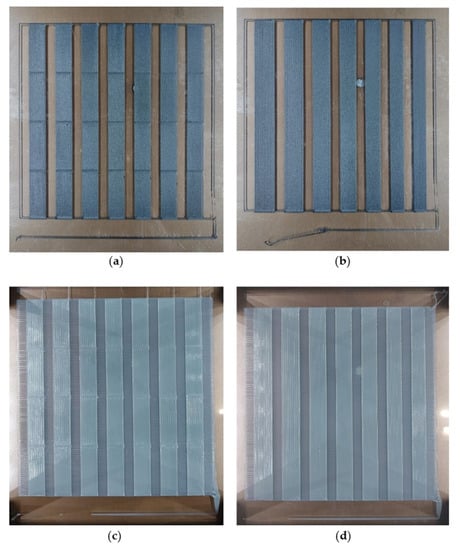 Samples of printability tests. Material and process parameters tested: (a) TX1501-7.3%CFs, with their first-layer track height and first-layer printing speed; (b) TX1501-7.3%CFs with a first-layer track width; (c) TPU extrusion temperature and printing speed; (d) TPU track width.