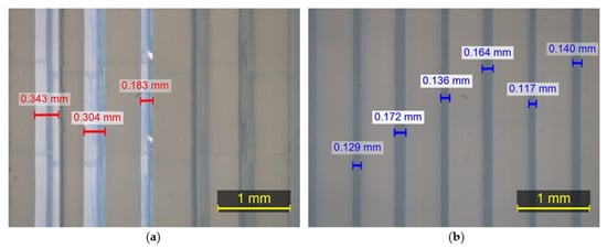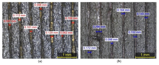 The test samples printed for the printability assessment were evaluated with a Leica S9 D stereoscope in order to identify and quantitate potential overfill or underfill defects. Figure 14 and Figure 15 present some examples of overfill and underfill defects detected through the evaluation process of TX1501-7.3%CFs and TPU, respectively. In the case of multiple regions with great printability performance, the ones printed with parameters that minimized printing time, namely, higher values of printing speed, track height, or track width, were preferred.