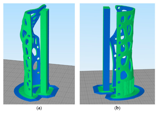 Printing preview mode of the orthopedic device (Slicing software: Simplify3D 4.1.2): (a) 1st main part; (b) 2nd main part.