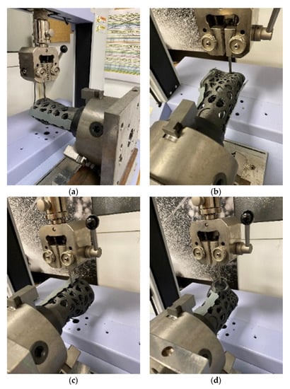 Our mechanical testing analysis focused on the demonstration and evaluation of the WHO;s efficiency in the four fundamental wrist moves examined with FEA: (a) flexion, (b) extension, and (c) radial deviation and (d) ulnar deviation, as was presented in Figure 12 []. For the testing implementation, two support modules were designed according to the data acquired from the limb scan and manufactured utilizing liquid crystal display (LCD) print technology. One base module was exploited to fix the tested WHO to the bending machine set-up, and the other was employed as a loading surface. The testing procedure consisted of the application of defined loads with 10 mm/min velocity in order to determine the relative displacements of the orthopedic device in the four tested cases. Figure 18 presents the load test set-up for each tested movement type utilizing a universal Shimadzu testing machine, while Table 3 indicates the applied load values that were also examined with FEA (as previously described in Table 2, Section 2.4).