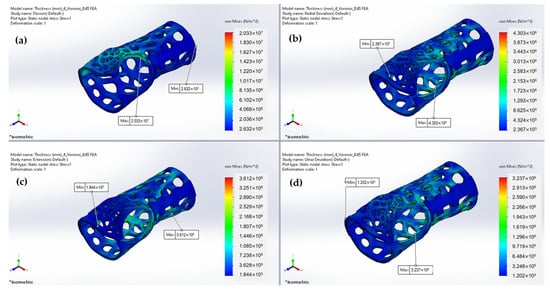 Furthermore, multiple design variations can be generated by means of (a) scaling the hollowed Voronoi tessellation pattern and (b) increasing/decreasing the outer rigid parts’ thickness. For the purposes of the present study, a Voronoi scaling factor of 0.65 and an outer rigid part thickness of 4 mm were selected after taking into consideration the in-house AM unit fabrication capabilities and the requirement for a robust yet material-efficient structure. The preliminary generated WHO (i.e., main body with two bands) further underwent FEA for static linear analysis (Step 7) in Dassault Systèmes SOLIDWORKS Professional 2021 software to predict the von Mises stresses and the local displacements. The CPE TX1501 and TPU material properties were assigned to the hard and soft WHO components, respectively. Both materials were considered isotropic. For representation purposes (in relation to the physical materials), hard components are depicted in black, and soft components are depicted in transparent off-white. Fixed-boundary conditions were assigned to the base of the WHO. Furthermore, bonded connection properties were assigned to the soft bands and the hard outer subcomponent interface. The WHO geometry was simulated under four load cases: (a) flexion, (b) extension, and (c) radial and (d) ulnar deviation, representing the four wrist movements (Figure 12) []. The load values selected from the literature [,,] are presented in Table 2. The load case of 50% was selected as the most representative, as it is assumed that the patient’s muscle strength is reduced and, therefore, not able to exert a 100% load on the WHO during rehabilitation.