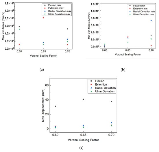 Voronoi scaling factor influence on (a) max von Misses stress value; (b) min von Misses stress value; (c) max displacement.