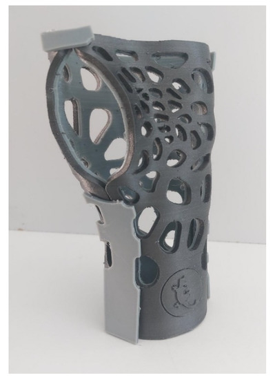 The present study aims to develop an integrative methodology for a precompiled customization system by means of material selection and an interactive CAD interface for 3D printed WHOs. The proposed methodology allows clinicians to verify the state of the WHO production at every stage, thereby facilitating the adjustment of input content or other parameters. In this scope, the developed WHO capitalizes on reverse engineering (i.e., 3D scanning) and computational/parametric design tools (i.e., visual programming and FEA) for surface data acquisition and semi-automated design customization and validation, combined with fused filament fabrication (FFF) 3D printing and material design/analysis for optimum fitting and functional properties. The parametric environment enables the interactive selection of the WHO’s thickness and lattice pattern according to each incident’s support requirements, as well as its segregation into multiple functional parts for efficient 3D printing (DfAM) []. More specifically, the integration of dual-material printing properties allows for different functionalities in selected areas (namely rigid or flexible parts) and/or non-irritant skin properties on the surface in contact with the patient’s limb. Furthermore, in terms of recycling (DfR) [], the proposed design methodology capitalizes on recyclable materials, while features that facilitate the sorting of the materials are integrated, considering the printing orientation of the parts to avoid the fusion of distinct layers of materials. Additionally, the presented WHO design supports the incorporation of near-field communication (NFC) and radio frequency identification (RFID) labels for storage and immediate access to a range of information connected with the WHO, namely the user guide, maintenance instructions, data concerning the materials used, and environmental impact.