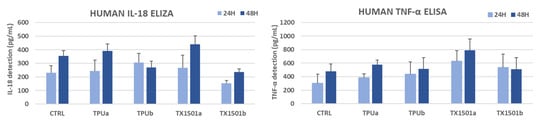 In terms of their skin-sensitizing potential, it should be noted that the materials used in the WHO development came in direct contact with the skin cells (Hs27). As already mentioned, the TPU (TPUa) and TX1501 7.3% CFs (TX1501b) were used for WHO development. A commercial TPU with antimicrobial properties (TPUb) and pure TX1501 (TX1501a) were also tested in pairs, respectively. After 24 and 48 h of exposure, the release of the proinflammatory cytokines IL-18 and TNF-α in the cell culture medium was measured by ELISA. After performing the calibration curves for IL-18 and TNF-α and the subsequent analysis of concentrations (pg/mL) obtained by means of the equation of the straight line generated by the calibration curve, the average of each sample was calibrated and compared with its respective control independently according to the exposure times. The results were analyzed by performing one-way ANOVA tests, where p-values > 0.05 were not considered statistically significant. At least 3 separate experiments were performed. As shown in the graphs (Figure 24), no significant detection of the proinflammatory cytokines upon exposure of the cells to the materials used in the WHO development was observed compared to the control samples. These findings led to the conclusion that WHO materials might not induce inflammation as an indicator of skin sensitization.