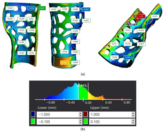 With regard to the front part of the 3D-printed WHO, which comes into contact with the palm of the hand, the tolerance distribution chart presented in Figure 25b demonstrates that 24.84% of the component surfaces exhibit tolerance values within the range (−0.1 mm, 0.1 mm). Positive maximum deviations were observed locally near the wrist, measuring 1.599 mm, whereas negative deviations reached 0.822 mm along the fitting line (Figure 25a). The majority of the part tolerance values were measured between −0.8 mm and −0.1 mm, implying the existence of undersized regions, possibly related to material shrinkage during solidification. Furthermore, from Figure 25b, we can deduce that the center of the distribution approximates the value −0.2 mm.