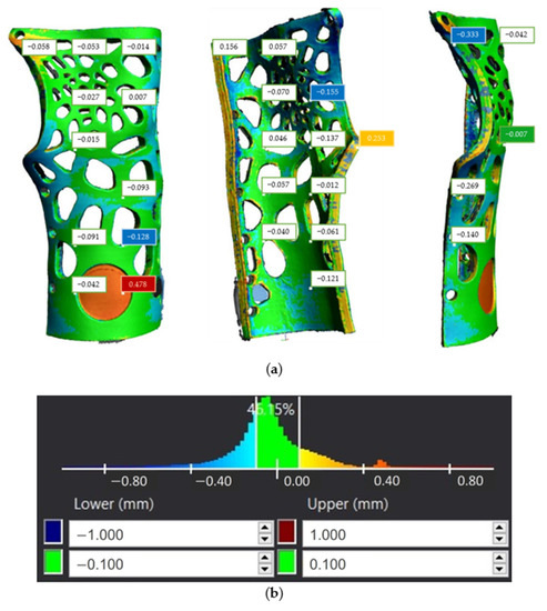 With respect to the second part of the brace, the tolerance distribution chart seen in Figure 26b shows that 46.15% of the component surfaces indicate tolerance values in the range (−0.1 mm, 0.1 mm), while the rest of the tolerance values are distributed both over positive and negative values. The maximum positive deviation appeared to reach 0.478 mm, while under-sizing was considerably limited compared to the first component by exhibiting a maximum negative deviation of 0.333 mm, as depicted in Figure 26a. Furthermore, from Figure 26b, we can infer that the center of the distribution is close to the value −0.05 mm.