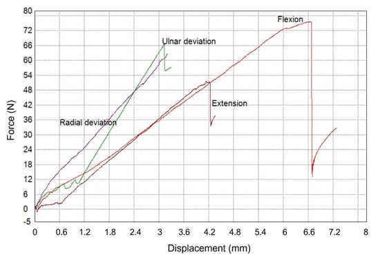 Figure 27 presents the generated force–displacement diagram during the implementation of the mechanical testing, while the splint-relative displacements exhibited at the maximum applied load of each case are presented in Table 6. It can be derived from Figure 27 that in the case of ulnar and radial deviation, the displacement that occurs is less compared to flexion and extension for a load value greater than approximately 15 N. Moreover, Table 6 indicates that the maximum relative displacement was presented during the realization of the flexion movement when the maximum tested load was also applied. However, the developed WHO did not exhibit breakage in none of the tested cases, and therefore, since the loads applied exceed the force value that could be exerted by an injured hand, it can be concluded that the presented WHO can withstand the mechanical loads applied in a real case.