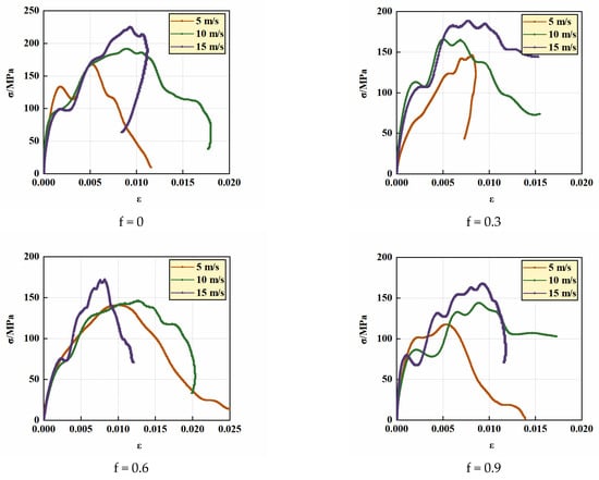 Figure 5 shows the voltage and time evolution curve of typical sandstone. According to the figure, the author selects three kinds of waves to calculate the stress–strain of sandstone. Rock properties undergo changes with varying water content, and the stress–strain curve is a fundamental tool for studying these properties. In this study, stress–strain curves were plotted for rocks subjected to different water content and impact velocities, as depicted in Figure 6. The stress–strain curve exhibits three distinct stages: elastic, plastic, and post-peak. Analysis of Figure 6 reveals a notable influence of water content on the strength of the rock specimens. As water content increases, the peak value of the stress–strain curve decreases. This phenomenon can be attributed to the enhanced interconnectivity of weaker pores and fractures within the rock formation facilitated by increased water content, resulting in a reduction in the peak value of the stress–strain curve.