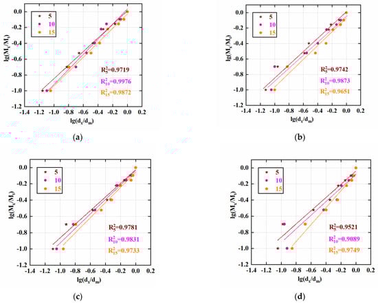 Figure 10 is the fractal process of the specimen. The distribution of mass and frequency is depicted in Figure 11. The figure illustrates that the water content will have a major influence on the mass frequency distribution diagram of rocks. Furthermore, as can be observed from the figure, the bullet velocity significantly affects the mass frequency distribution of the rock. The mass frequency profile is at the top when the bullet is traveling at 15 m/s. Figure 12 is a schematic diagram of the fractal dimension. From the figure, it is clear that with a rise in water content, the fractal dimension increases. For instance, when the velocity of the bullet is 15 m/s, D is 2.07 and the water content is 0. When the water content is 0.9, D is 2.17. Bullet velocity also significantly affects the fractal dimension. There is a positive association between fractal size and bullet velocity. The water content influences the distribution of particle size in the rocks considerably. There is a positive relation between the rock’s fractal dimension and water content.