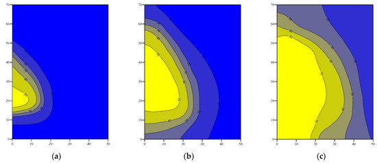 The saturation of natural-gas hydrate along with the boundary of the reservoir changed from 0.5 to 0 within one grid (Figure 9), as overburden and underburden of the reservoir are non-permeable cover layers and there was no heat and mass flow through the boundary of the reservoir. The saturation-distribution contours for different heat-injection temperatures or different heat-injection rates show uniformly prominent features, i.e., saturation of natural-gas hydrate steeply changed from 0.5 to 0 in a narrow area, indicating that natural-gas-hydrate decomposition occurred only in this area. The saturation distribution can be clearly divided into three areas: constant 0.5 saturation area, saturation steeply changing area, and constant 0 saturation area, so the reservoir can be divided into three different areas: hydrate area, gas/water/hydrate area, and gas/water area.