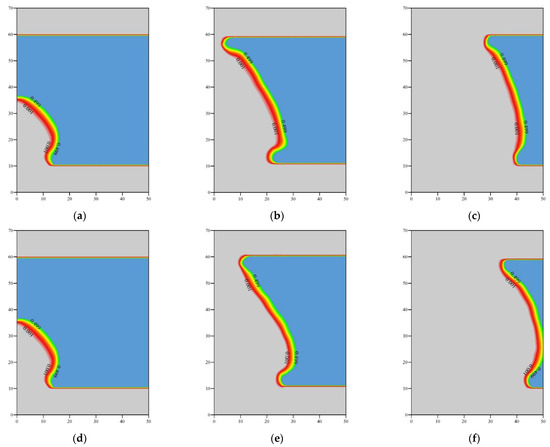 The overall saturation distribution contours of natural gas hydrates show a similar pattern, showing an outward convex trend along the injection-production direction with heat injection (Figure 9). The outward convex saturation-distribution contour around the injection-well bore was more backward, which indicates that the natural-gas hydrate decomposed faster around the injection-well bore. The outward convex saturation-distribution contour gradually moved forward as simulation time progressed with heat injection.