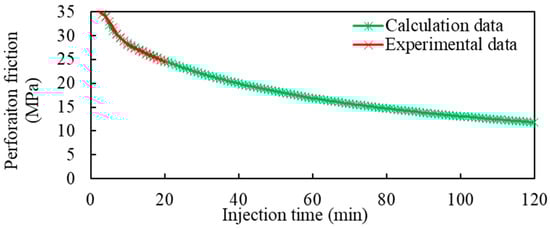 The reliability of the model was verified against the experimental test. As shown in Figure 1, when the perforation coefficient is selected as 0.7, the perforation friction based on Equation (1) is consistent with that from the experimental test. The fluid injection rate per perforation is 0.9 m3/min and the proppant concentration is 180 kg/m3. The model is simple and considers the effects of the perforation diameter, the perforation number, the fluid injection rate, and the fluid density. The initial perforation parameter can be quickly optimized based on Equation (1).