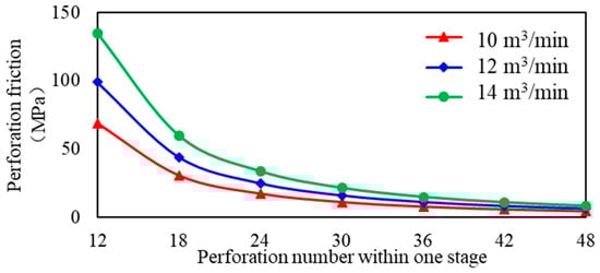 Figure 2 gives the perforation friction calculation results based on Equations (1) and (2). The perforation friction increases with the fluid infection rate and decreases with the perforation number. When the perforation number within one stage is less than 30 (4 perforations per cluster), the perforation friction is significantly affected by the perforation number; when it is beyond 30, the effect of perforation number on the perforation friction can be neglected. As for the perforation number of 3 per cluster (total 18 perforations within one stage), the perforation frictions are, respectively, 39.6 MPa, 44.1 MPa, and 60 MPa, corresponding to fluid injection rates of 10 m3/min, 12 m3/min, and 14 m3/min. As for the perforation number of 5 per cluster (total 30 perforations within one stage), the perforation frictions are, respectively, 11.0 MPa, 15.9 MPa, and 21.6 MPa, corresponding to fluid injection rates of 10 m3/min, 12 m3/min, and 14 m3/min. As for the perforation number of 8 per cluster (total 48 perforations within one stage), the perforation frictions are, respectively, 4.3 MPa, 6.2 MPa, and 8.4 MPa, corresponding to fluid injection rates of 10 m3/min, 12 m3/min, and 14 m3/min. Therefore, the perforation friction will be beyond 5 MPa considering part of the perforations receive no fracturing fluid when the perforation number per cluster is designed as eight.