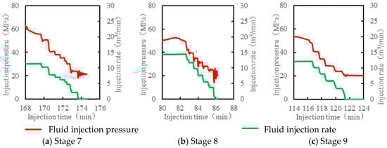 The step-down test is carried out after the completion of the proppant injection. The maximum fluid injection rate decreases gradually with four to five stages. At each stage, the fluid injection rate and the injection pressure are collected when the fluid injection pressure is stable. The near-wellbore friction and the perforation friction can be obtained based on the step-down test. In this work, after the completion of the proppant addition, the step-down tests were carried out by reducing the fluid injection rate with several steps. The fluid injection pressure was collected and compared for different perforation numbers. Figure 3 gives the fluid injection pressure curves with the fluid injection rate for the perforation numbers three, five, and eight, respectively. The red lines represent the fluid injection pressure and the green lines represent the fluid injection rate. The points of the stable injection pressure for each fluid injection rate were collected. Comparing the fluid injection pressure of the same fluid injection rate, the effect of the perforation number on the perforation friction can be discovered and the optimal perforation number can be determined.