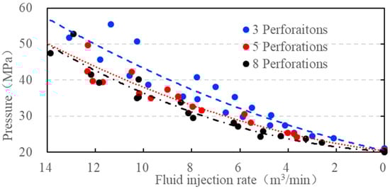 Figure 4 gives the scatter diagram of the fluid injection pressure and the fluid injection rate with different perforation numbers. The data points marked three perforations and include the test results of the 7th, the 10th, and the 13th stage; the data points marked five perforations and include the test results of the 8th, the 11th, and the 14th stage; the data points marked three perforations and include the test results of the 9th, the 12th, and the 15th stage. Figure 4 shows that when the fluid injection rate reduces to 0 m3/min, the injection pressure is about 20 MPa, which reflects that the fracture closure pressures for all perforation schemes are the same. The reason is the horizontal minimum principal stresses for the nine stages have a negligible difference. Moreover, the higher the fluid injection rate, the larger the difference in the fluid injection pressure for different perforation schemes. When the fluid injection rate is less than 6 m3/min, the fluid injection pressures are almost the same.
