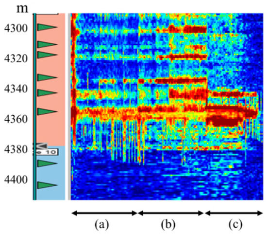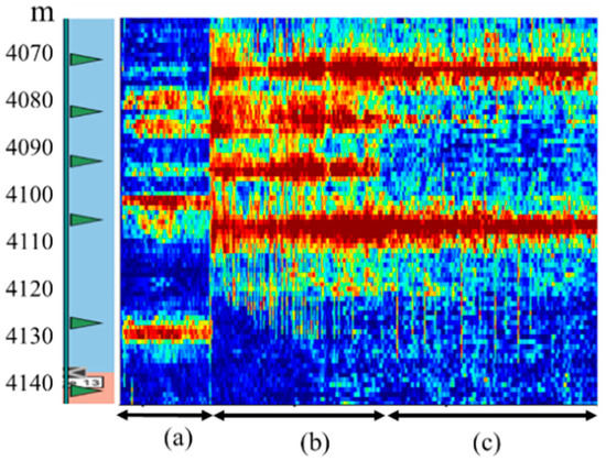 The optical fiber (OF) technology records the vibration and acoustic waves generated from the fracturing fluid injection and the fluid flow rate and volume can be analyzed after the inversion. OF is more sensitive to vibration and acoustic waves than temperature, so it can identify fracturing injection sites (perforation clusters) at higher resolution. Two fracturing stages of well B are selected. There are six perforation clusters in the 11th stage and five perforation clusters in the 14th stage. The perforation number per cluster is eight for both stages. As shown in Figure 7 for section (a), when the fluid injection rate is 8 m3/min, each perforation cluster can receive fluid, while the intensity of the acoustic signal has an obvious difference. The first cluster and the second cluster have strong acoustic signals. When the fluid injection rate reaches up to 10 m3/min (Figure 7 for section (b)), the fluid distribution among multiple fractures is more uniform and the horizontal lateral can be stimulated effectively. With the continuous injection of the proppant, the perforations are gradually eroded, and the LEF effect is reduced. After the injection of 80 kg proppant, some perforation clusters no longer receive fracturing fluid, resulting in uneven fracture propagation in the later stage (Figure 7 for section (c)). Temporary plugging technology (TPT) can plug the erosion perforations by injection of the diverters. In this way, multiple fractures can receive the same amount of proppant during the sand-adding stage [].