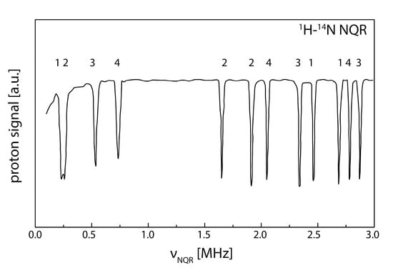 - Seliger, J.; Žagar, V.; Blinc, R. 1H-14N Nuclear Quadrupole Double Resonance with Multiple Frequency Sweeps. Z. Naturforschung A 1994, 49, 31–34. [Google Scholar] [CrossRef]
