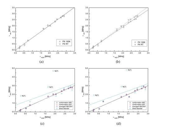 On the contrary, the model that averages two structures RT ABC and RT DEF (named as RT ABCDEF averaged) is quite reliable, as seen in Table 2 and Figure S1a,b. Both structures, RT ABC and RT DEF, differ in the conformation of the methyl group at N(7), as in Figure 1, in which only in the RT DEF structure is close to the low-temperature one. The underestimation of e2Qq/h and overestimation of η only for the >N(3)H site suggests its participation in the strong hydrogen bond N–H⋯O and, consequently, the shift in the proton from nitrogen towards the acceptor (=O). In the PX structure, the N–H⋯O bonds do not occur singly, but in pairs i.e., two N(3)H⋯O(2) hydrogen bond link two PX molecules into a dimer. At higher temperatures, the probability that the concerted proton jumps in such a double bond increase. These jumps average the electron density at the nitrogen site >N(3)H and the EFG tensor, which results in the lower-than-expected values of e2Qq/h and η.